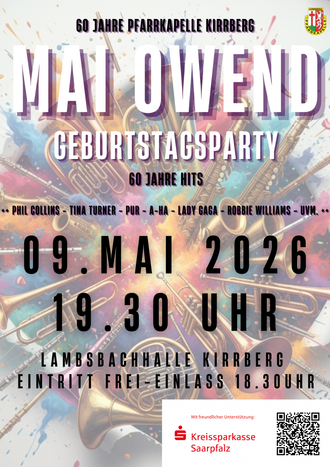 Der MAI OWEND der Pfarrkapelle Kirrberg ist zurück – und diesmal wird richtig gefeiert! Unter dem Motto „Geburtstagsparty – 60 Jahre Hits“ laden wir Euch ein, gemeinsam mit uns das 60-jährige Bestehen der Pfarrkapelle Kirrberg zu feiern.